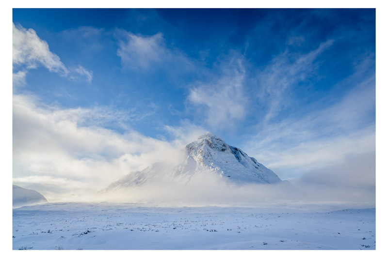 I had to shoulder the sliding door to free it. When it finally gave, I stepped out into still, deep snow all around the van. It had drifted and piled to roughly two feet in places. A practical thought floated in: Will I be able to get back out tomorrow and make it to work in Edinburgh? It didn’t stay long. The place had me. The usual Glen Etive view was transformed — ridges, slopes and boulders all reduced to simple shapes under a pure white covering.